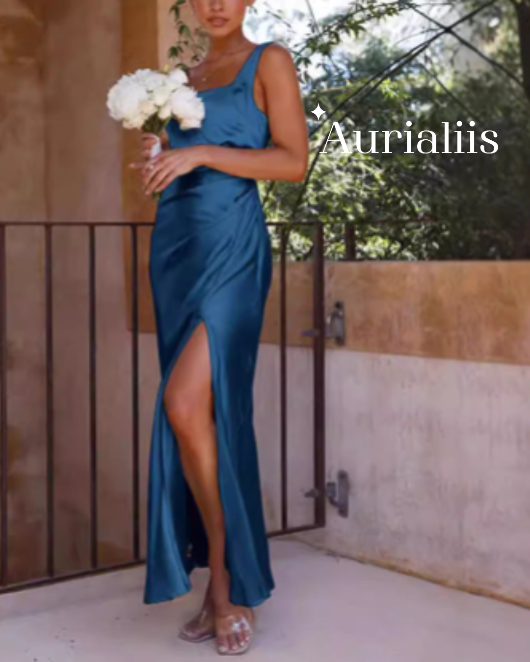 Women's Satin Square Collar Backless Slit Length Dress